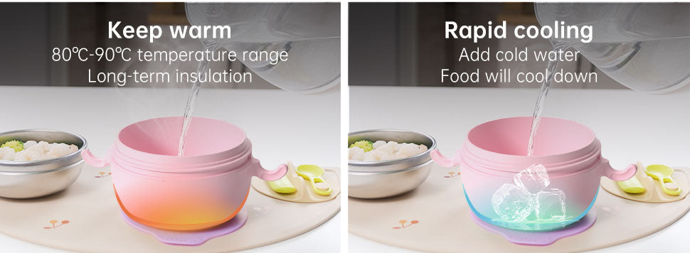 Gone are the days of waiting for food to cool down or heating it up. With our cutting-edge bowl, you can inject water at the perfect temperature to either cool down or warm up your baby’s meal quickly. This means your child gets to enjoy their food not only at a safe temperature but also without the lengthy wait, making mealtimes more efficient and enjoyable.