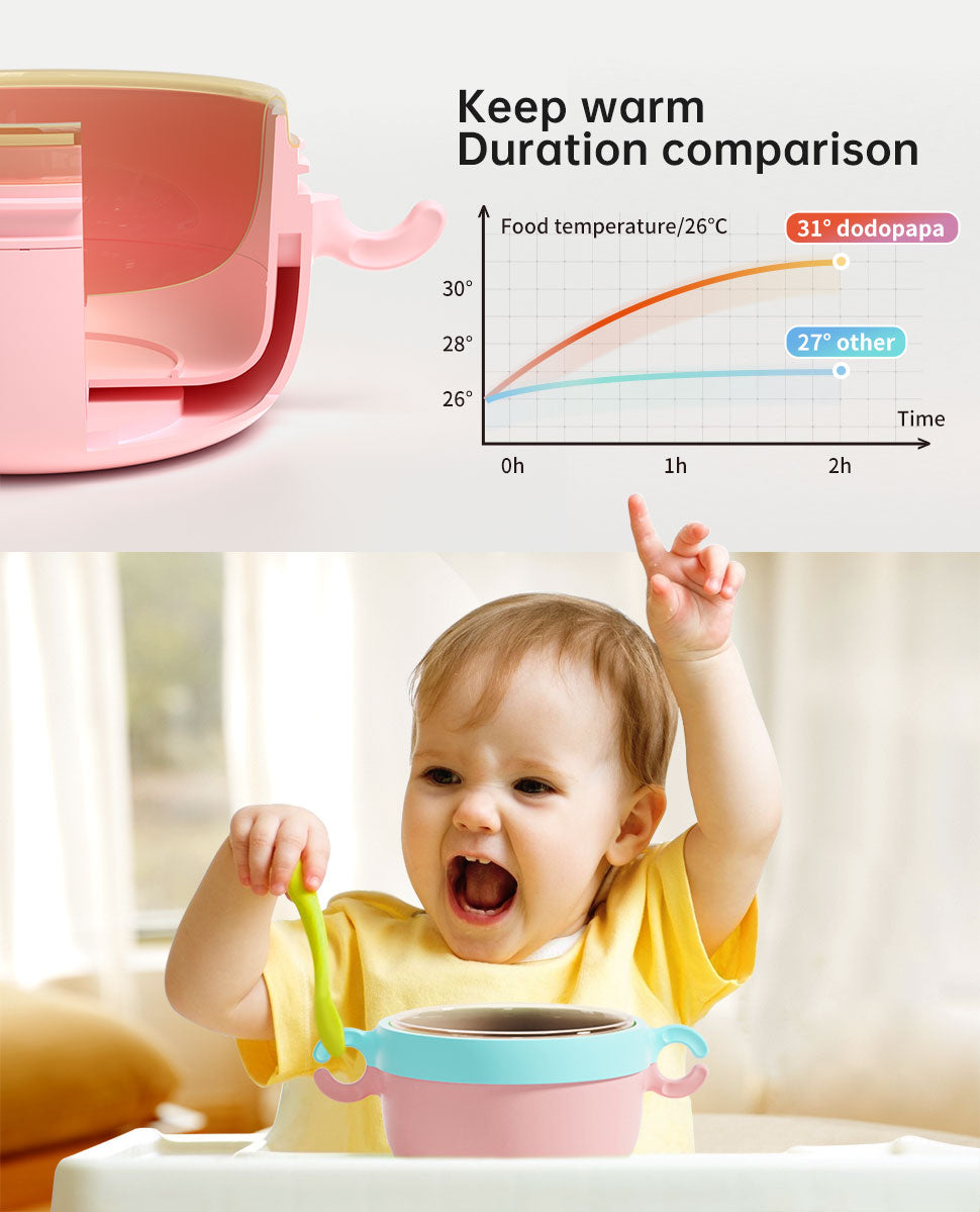 Our bowl’s state-of-the-art insulation structure is the result of meticulous engineering. By optimizing thermal properties, we’ve significantly improved insulation efficiency, ensuring that meals stay warm for longer periods. This enhanced capacity to maintain temperature means that your baby can take their time eating without the rush to beat the cold, making for a more relaxed and enjoyable mealtime.
